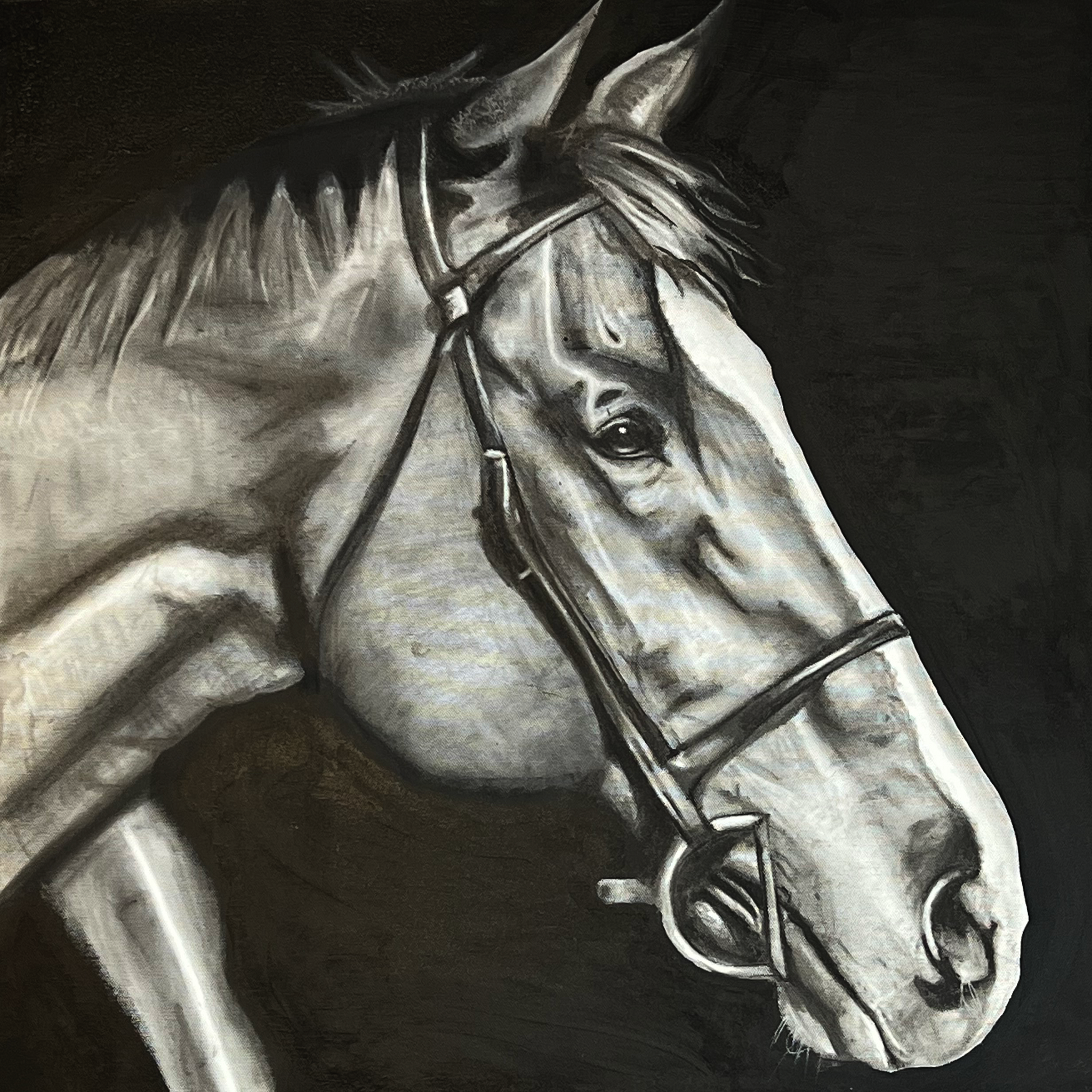 A captivating monochromatic horse drawing created using charcoal and acrylic paint.