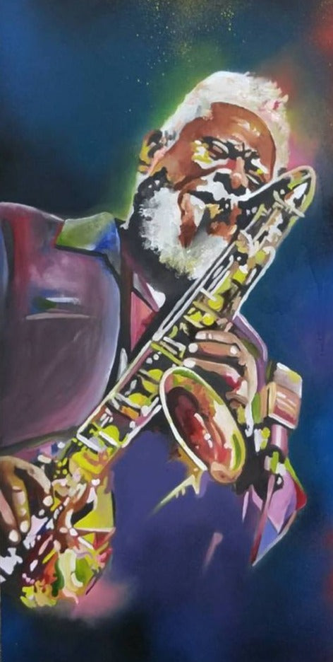 Pharaoh Sanders, is a American saxophone player that is mainly known for his iconic sound and inspirational impact on the jazz community. This painting was created using a mixture of media that includes acrylic paint, spray paint and oil paint.
